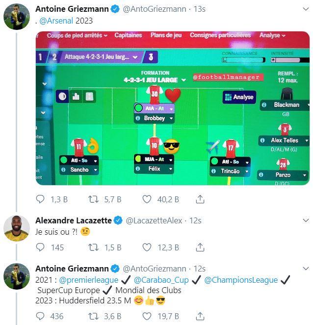 2019年,格列兹曼在玩足球经理游戏时,选择了阿森纳作为自己的球队,并且卖掉了好友拉卡泽特,随后带领球队夺得了欧冠冠军。拉卡泽特对此“表示伤心”,但两人在社交媒体上的互动却充满了欢乐。